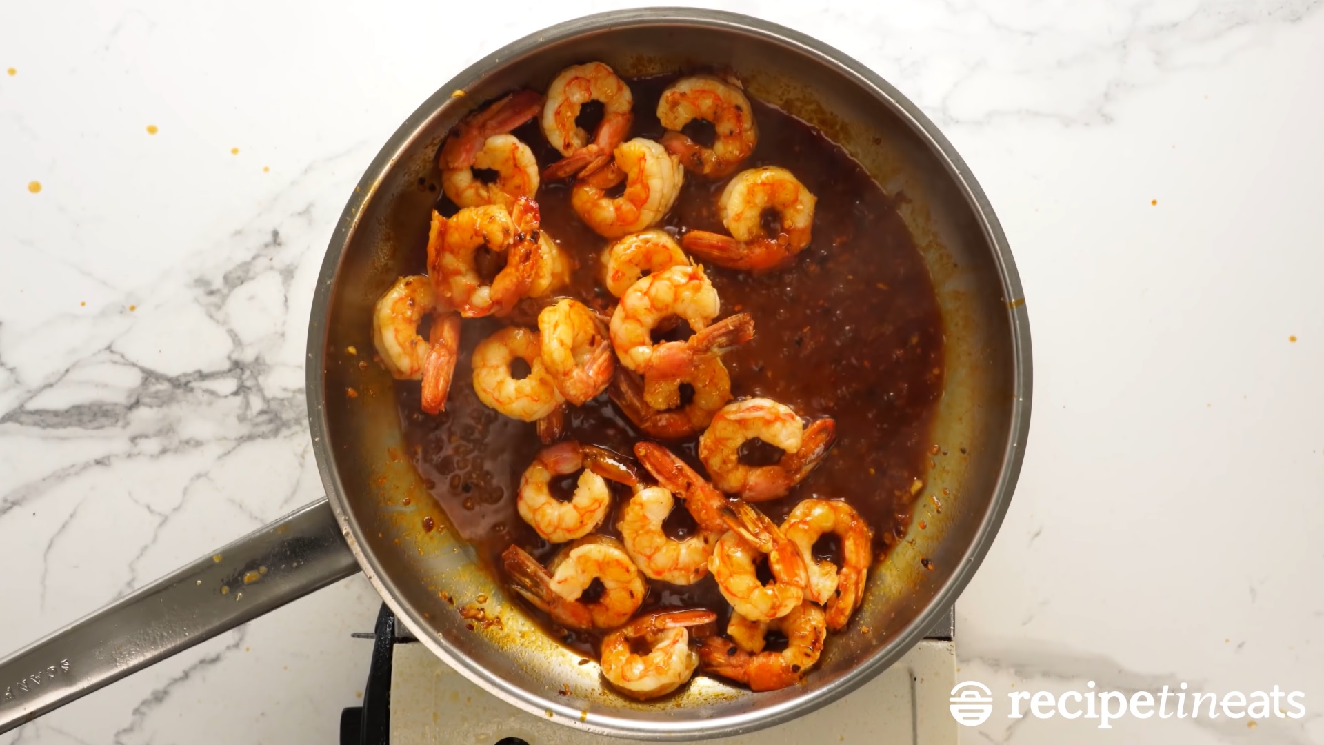 5. Add the fried prawns or shrimps into the frying pan and toss to coat in the sauce then cook for 1 - 2 minutes until prawns or shrimps are coated nicely.