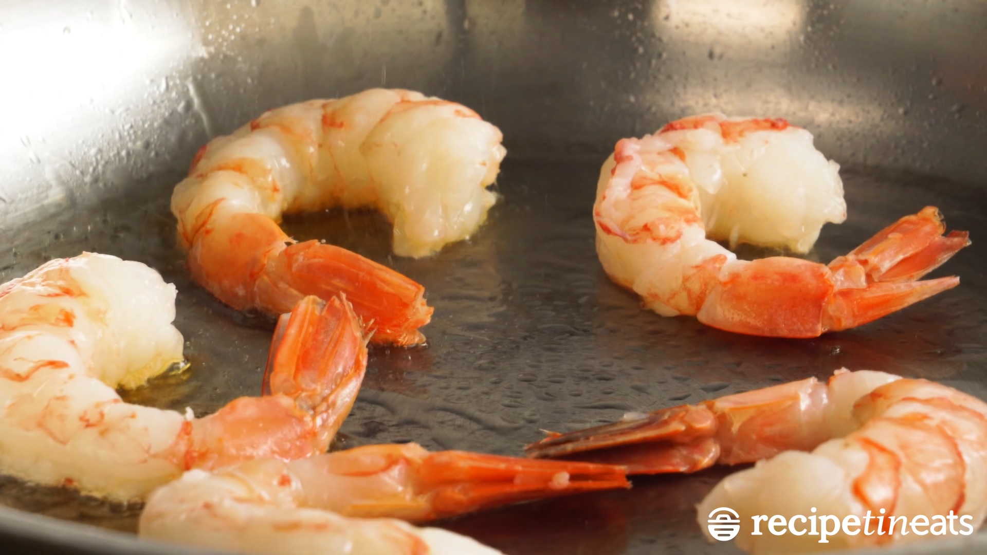 1. Heat oil in a frying pan over high heat. Fry the prawns or shrimps for about 45 seconds until golden, then remove into a bowl.