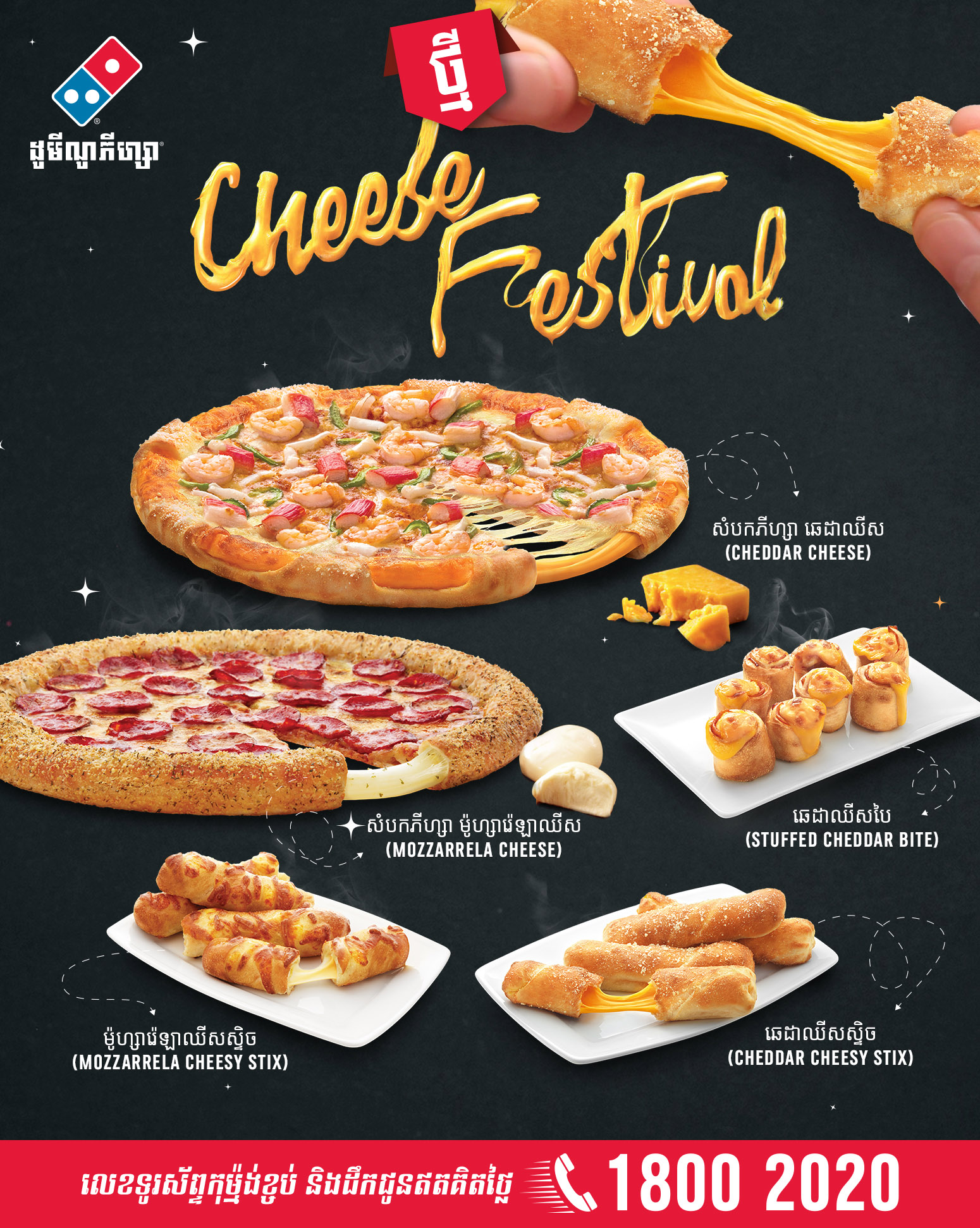ដោយឡែកថ្ងៃនេះ FoodBuzz ចង់មកណែនាំរបស់ឆ្ងាញ់ៗថ្មីចំនួន៥មុខដែល Domino’s Pizza ទើបតែដាក់លក់ក្ដៅៗ ក្នុងនោះមានដូចជាសំបកឈីសថ្មី 2ប្រភេទគឺ Mozzarella Cheese និង Cheddar Cheese រួមជាមួយអាហារសម្រន់ថ្មីបីមុខទៀតគឺ Cheesy Mozzarella Stix, Cheesy Cheddar Stix និង Stuffed Cheddar Bite។