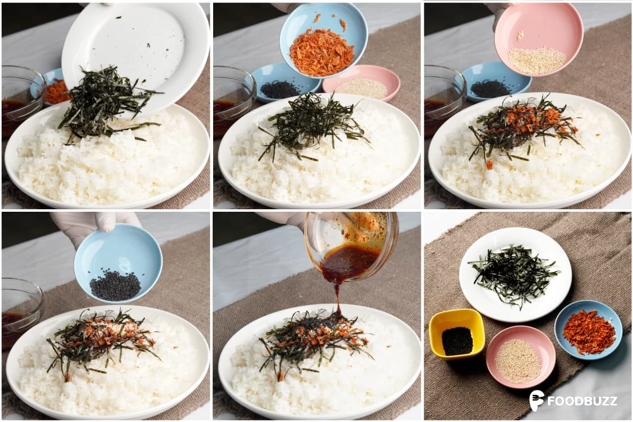 ២. យកចានធំមួយហើយដាក់បាយ សារ៉ាយ បង្គាក្រៀម គ្រាប់ល្ងស គ្រាប់ល្ងខ្មៅ និងទឹក Sauce ដែលលាយរួចចូល