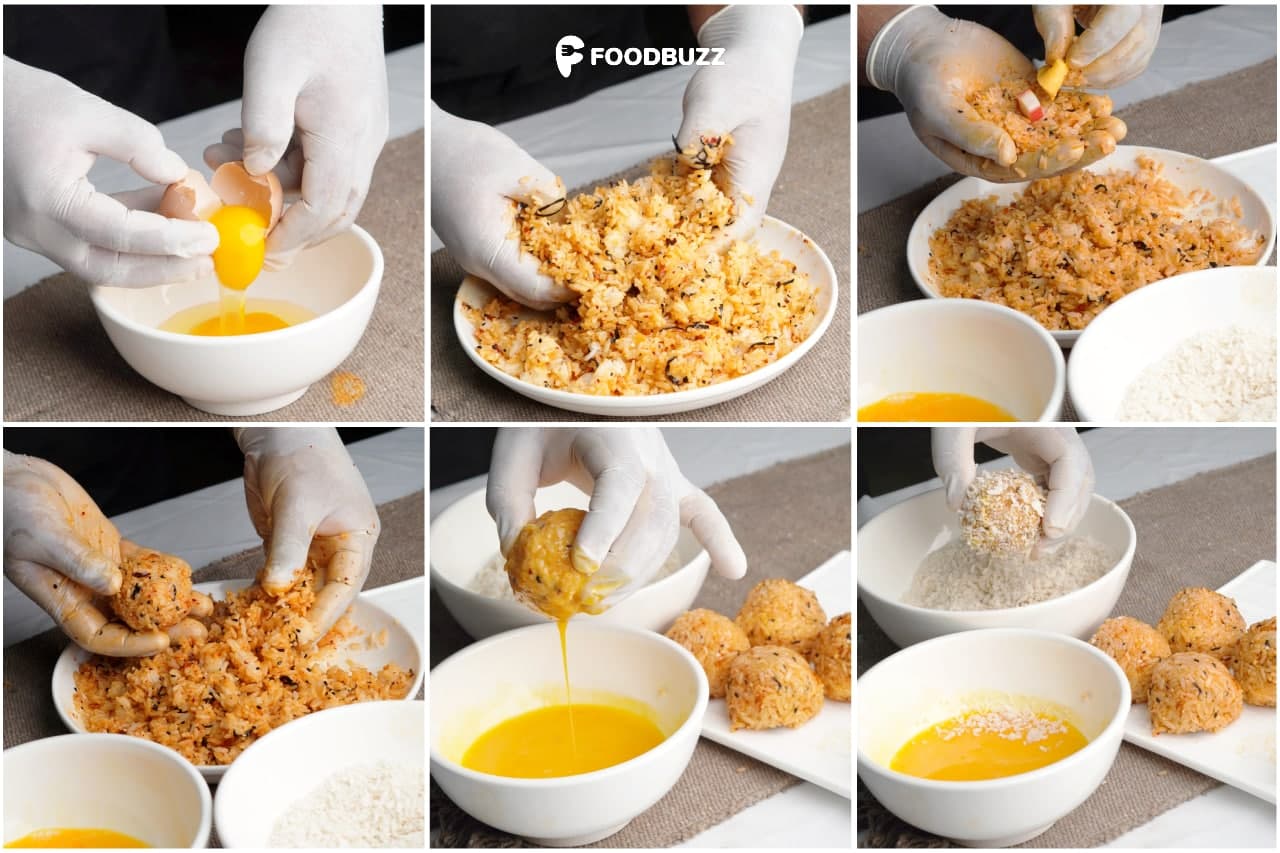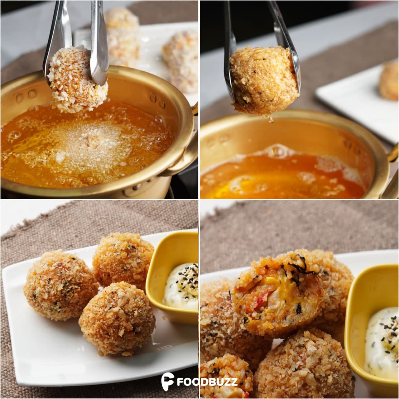 ៥. ពូនបាយឲ្យចេញជារាងដុំមូលៗ ដោយដាក់ប្រហិតសាច់ក្ដាម និងឈីសនៅចំកណ្ដាល