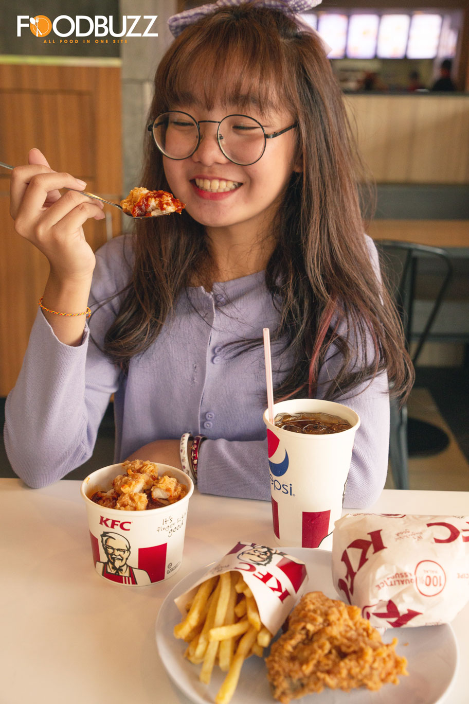 As always KFC does not come with an option, but various options to choose from its new seasonal set. We have tried two options – Rice Bowl Box Meal and Loaded Bowl Combo that satisfy 2 people. Rice Bowl Box Meal is perfect for a person who has big appetize which consists of 1 Rice Bowl, 1 piece of Fried Chicken, 1 Chicken Burger, 1 Regular Fun Fries, and a glass of Pepsi. Then, we order the Loaded Bowl that is suitable for a light eater. But both together is fantastic to share for 2 people.