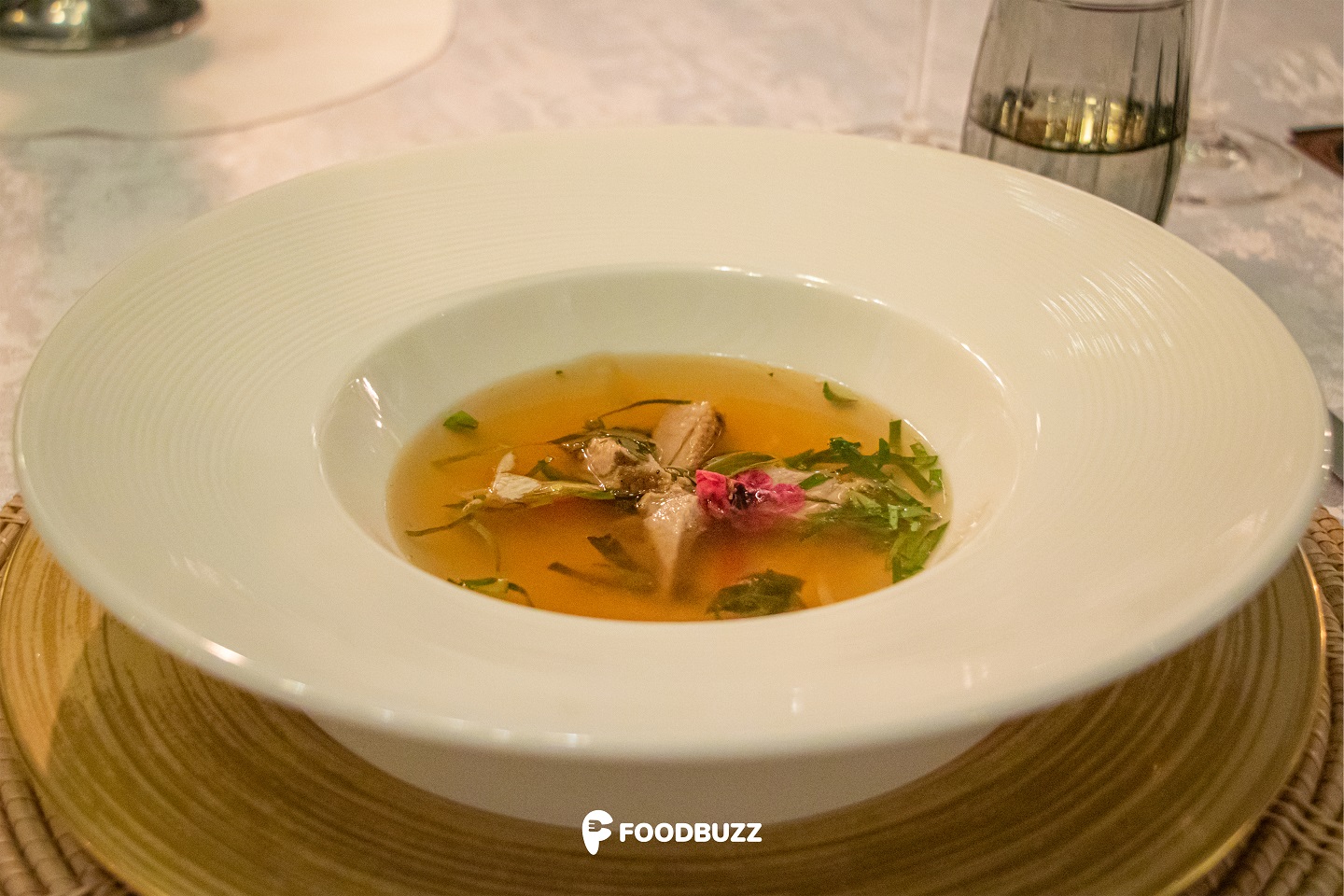 The Duck Sour Soup, featuring fresh curry, green sour leaves, and organic vegetables, pays homage to Somlor Machou Kreoung Tea Neung Sleuk Thneng, creating a harmonious blend of flavors in the consommé.