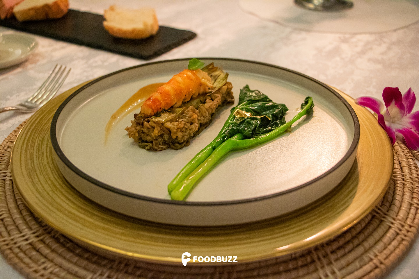 The Stir-Fried Takeo Lobster, a contemporary take on Chean Bangkorng Jeamouy Trop Doth Neung Sleuk Mrasprov, impresses with its combination of Mekong lobster, grilled eggplant, minced chicken, hot basil, and baby green mustard.