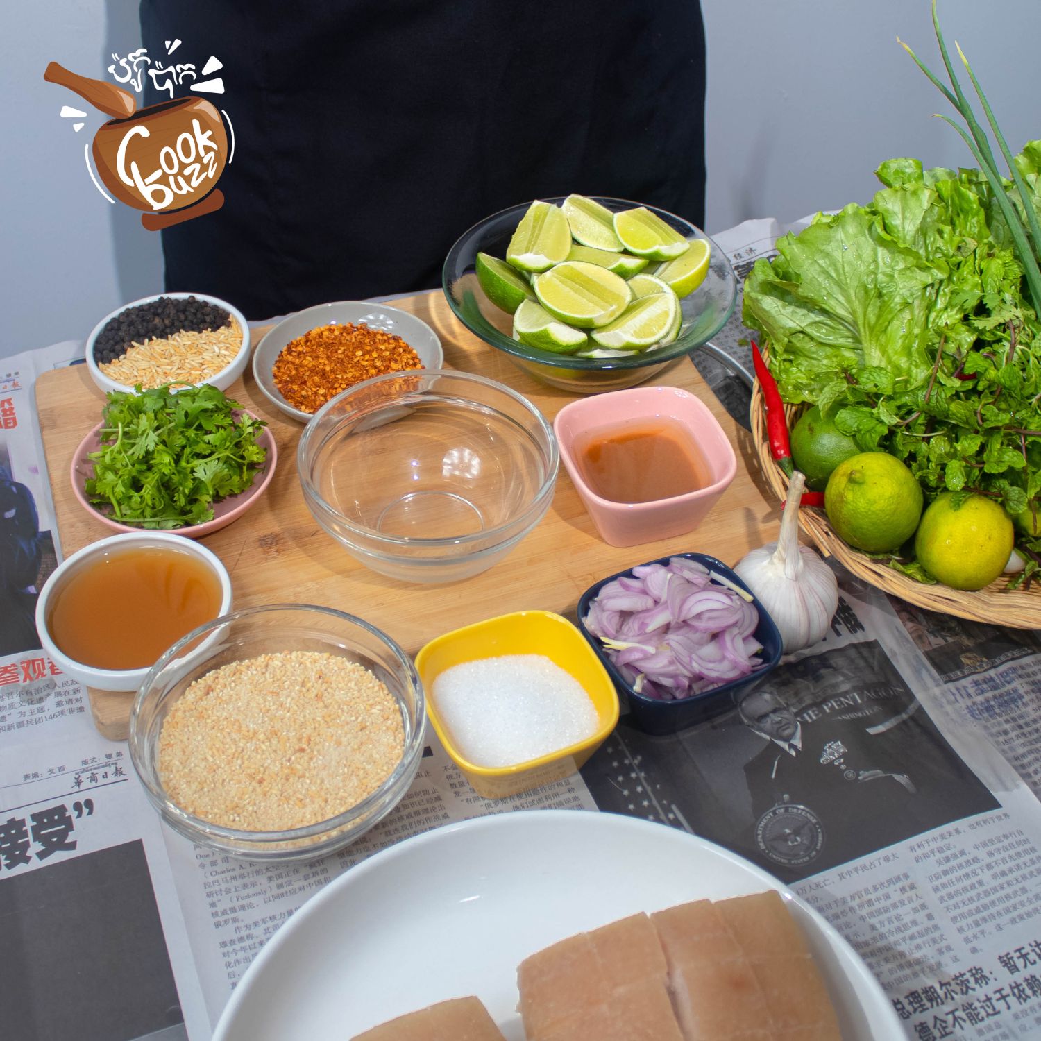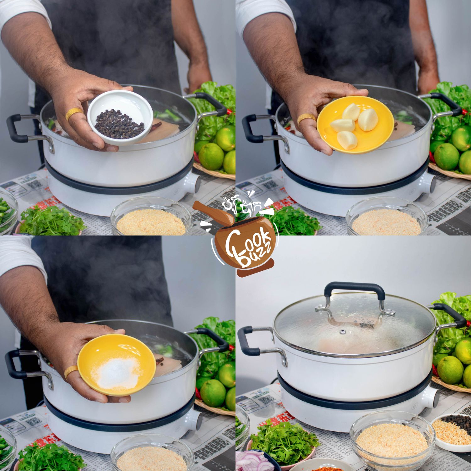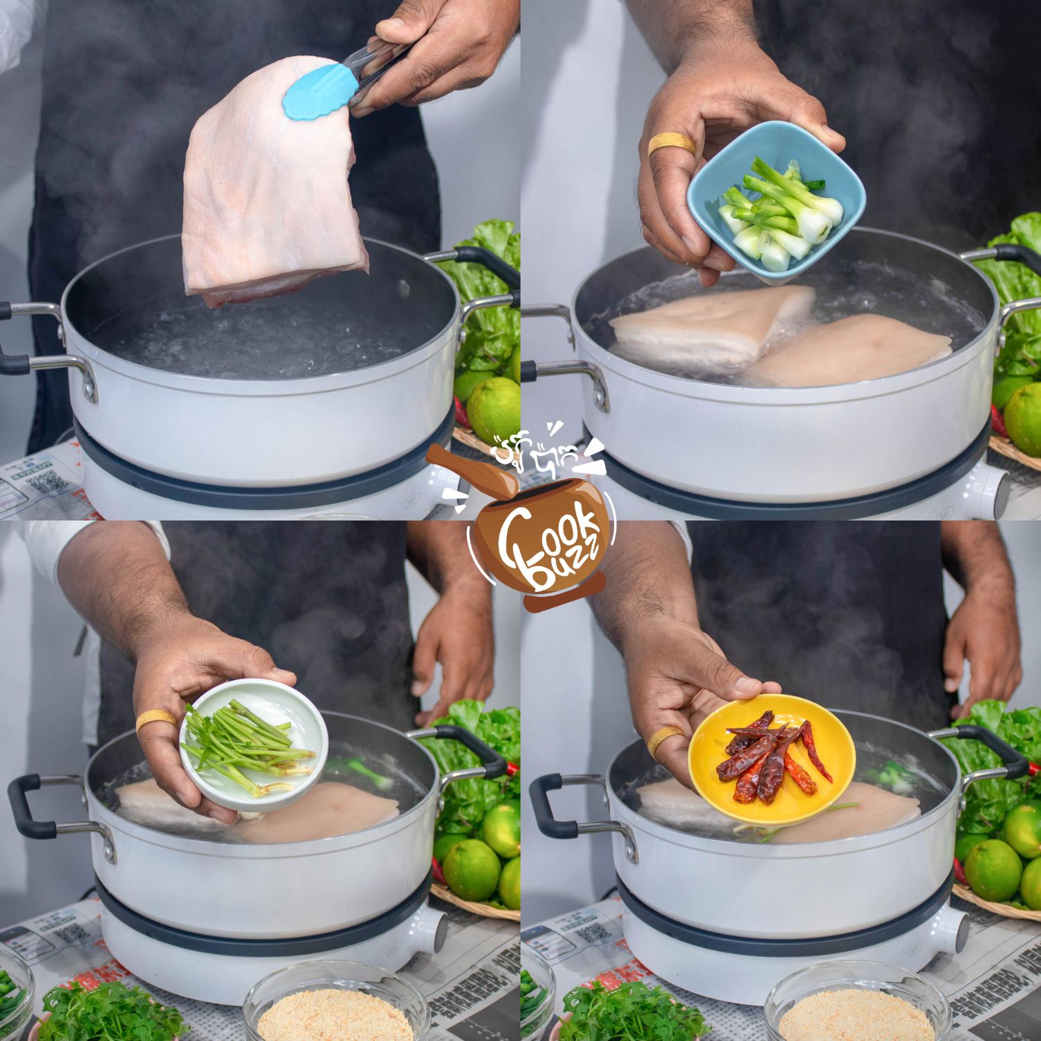1. ស្ងោរសាច់ជ្រូកបីជាន់ បន្ថែមគល់ខ្ទឹម គល់ជីវ៉ាន់ស៊ុយ ម្ទេសក្រៀម ម្រេសគ្រាប់ ខ្ទឹមស និង អំបិល ស្ងោររយៈពេល 15 នាទី