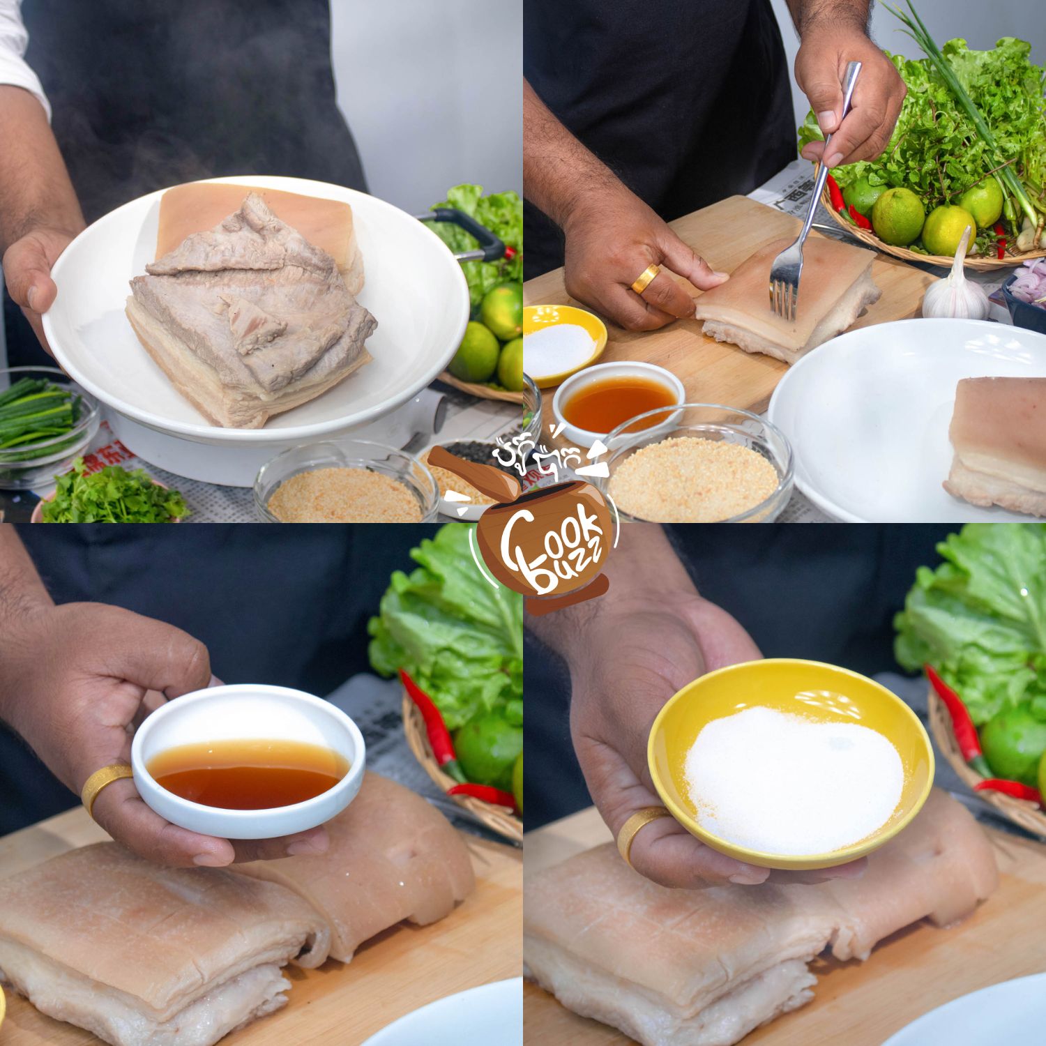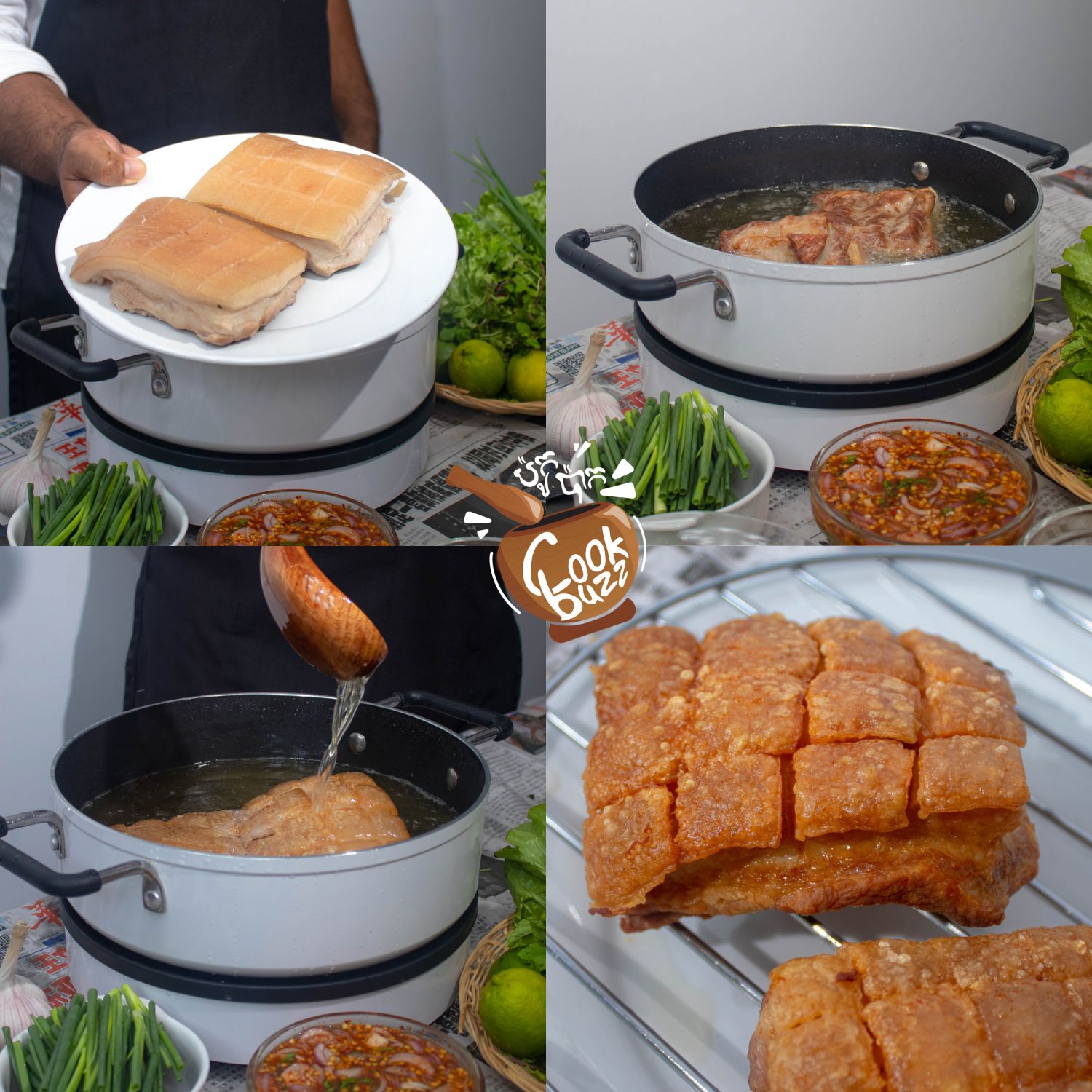 2. យកស៊មចាក់ពីលើស្បែកជ្រូកដែលស្ងោររួចនោះឲ្យសប់មុននឹងវះស្បែកនោះ រួចលាបទឹកខ្មេះនិងអំបិលពីលើឲ្យសប់ល្អ។ ទុកសាច់ជ្រូកអោយស្ងួតល្អរយៈពេលពី ២ ទៅ ៣ម៉ោងមុននឹងយកទៅបំពងរយៈពេល 15 នាទី។