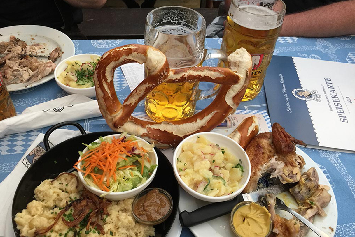 លើសពីនេះទៀត Oktoberfest មានអាហារឆ្ងាញ់ៗជាច្រើនដែលឆ្លុះបញ្ចាំងពីម្ហូបប្រពៃណីរបស់ Bavaria ។ មុខម្ហូបដែលពេញនិយមបំផុតនោះ គឺមាន់អាំង ជើងជ្រូក សាច់ក្រក ប្រេហ្សែល(pretzels) សាឡាត់ ដំឡូង និងមីជាមួយឈីស។ អាហារភាគច្រើនមានដាក់ mustard, horseradish, និង sauerkraut ។ ហើយបើសម្រាប់បង្អែមវិញ មានផ្លែប៉ោម នំstrudel នំplum និងនំប៉័ងខ្ញីបេះដូង។ អាហារទាំងអស់គឺមានរសជាតិផ្អែម ដើម្បីរក្សាតុល្យភា និងពឥទ្ធិពលរបស់ស្រាបៀរទាំងអស់នោះ។