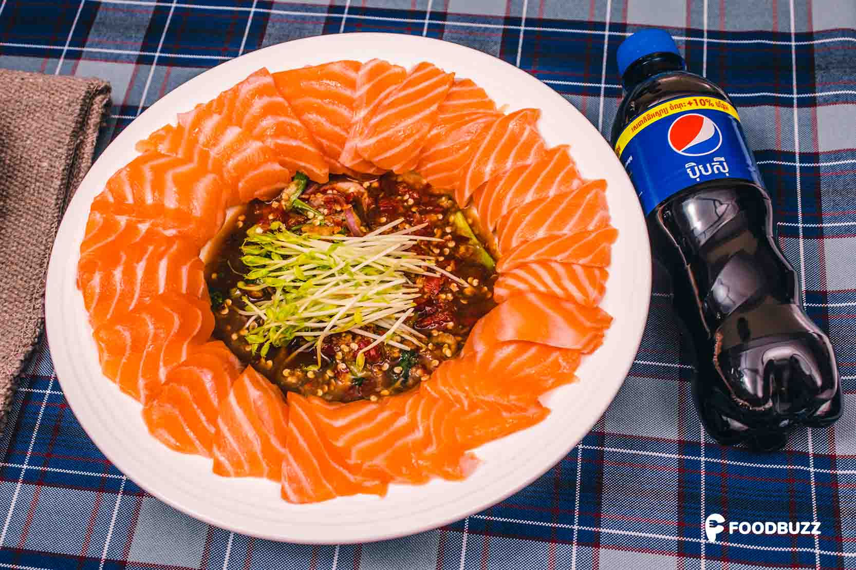 ៥. ហាន់ត្រីសាលម៉ុនជាចំណិតស្ដើងៗ រៀបដាក់លើចានហើយដាក់ទឹកត្រីសម្រាប់ញ៉ាំជាមួយ