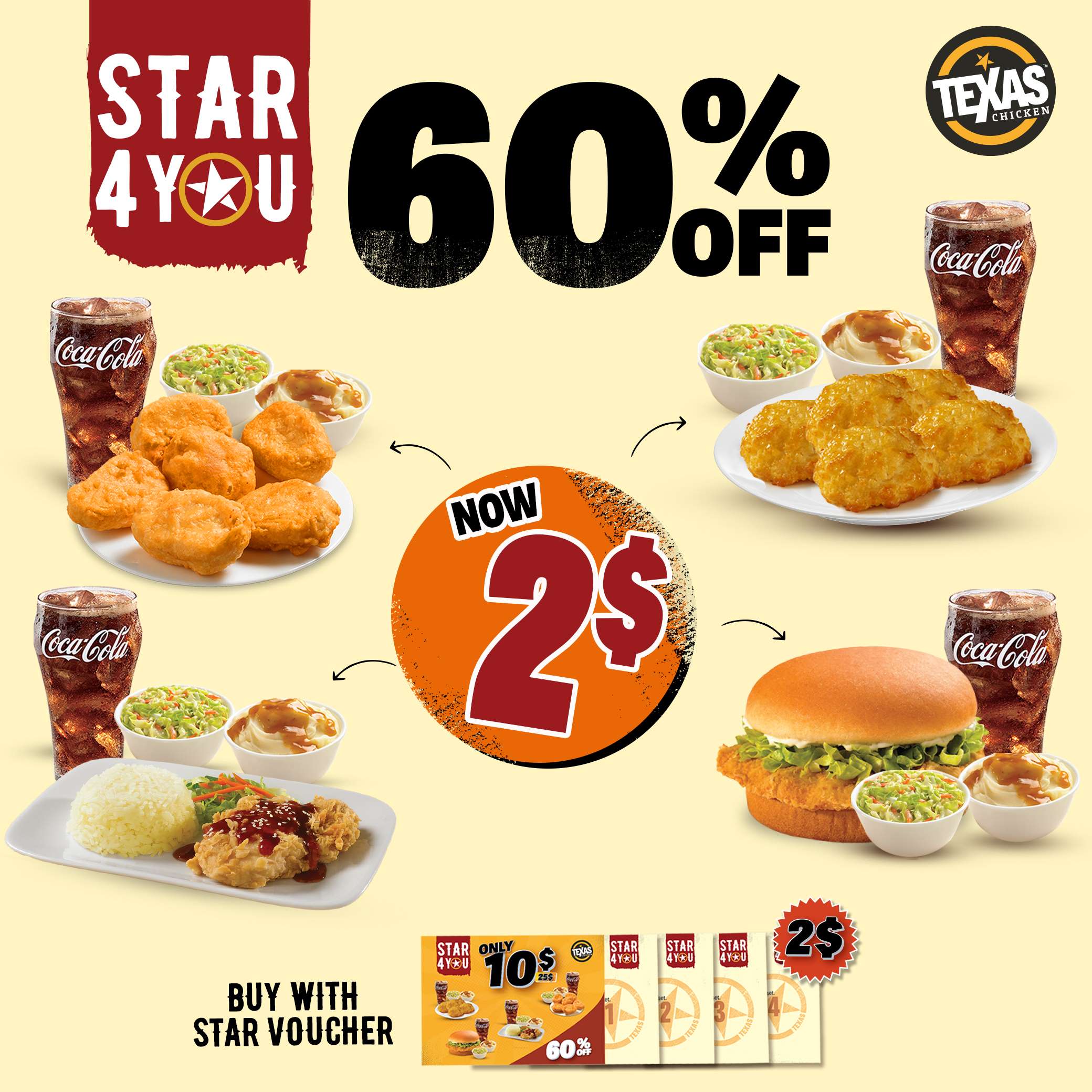 ឥឡូវនេះ Texas Chicken មានកម្មវិធីពិសេស «𝑺𝒕𝒂𝒓4𝒀𝒐𝒖» ចំណេញមែនទែន ដែល ៤ឈុត 𝑺𝒕𝒂𝒓4𝒀𝒐𝒖 បញ្ចុះតម្លៃពី $25 មកនៅត្រឹមតែ $10 តែប៉ុណ្ណោះ ឬរហូតដល់ 60% មានន័យថា ក្នុងមួយឈុតៗ ពិសេសនេះ មានតម្លៃត្រឹមតែ $2 តែប៉ុណ្ណោះ (បន្ទាប់ពីអតិថិជនបានទិញ គូប៉ុង STAR4YOU ក្នុងតម្លៃ $2) ។