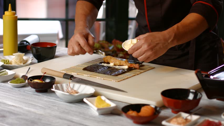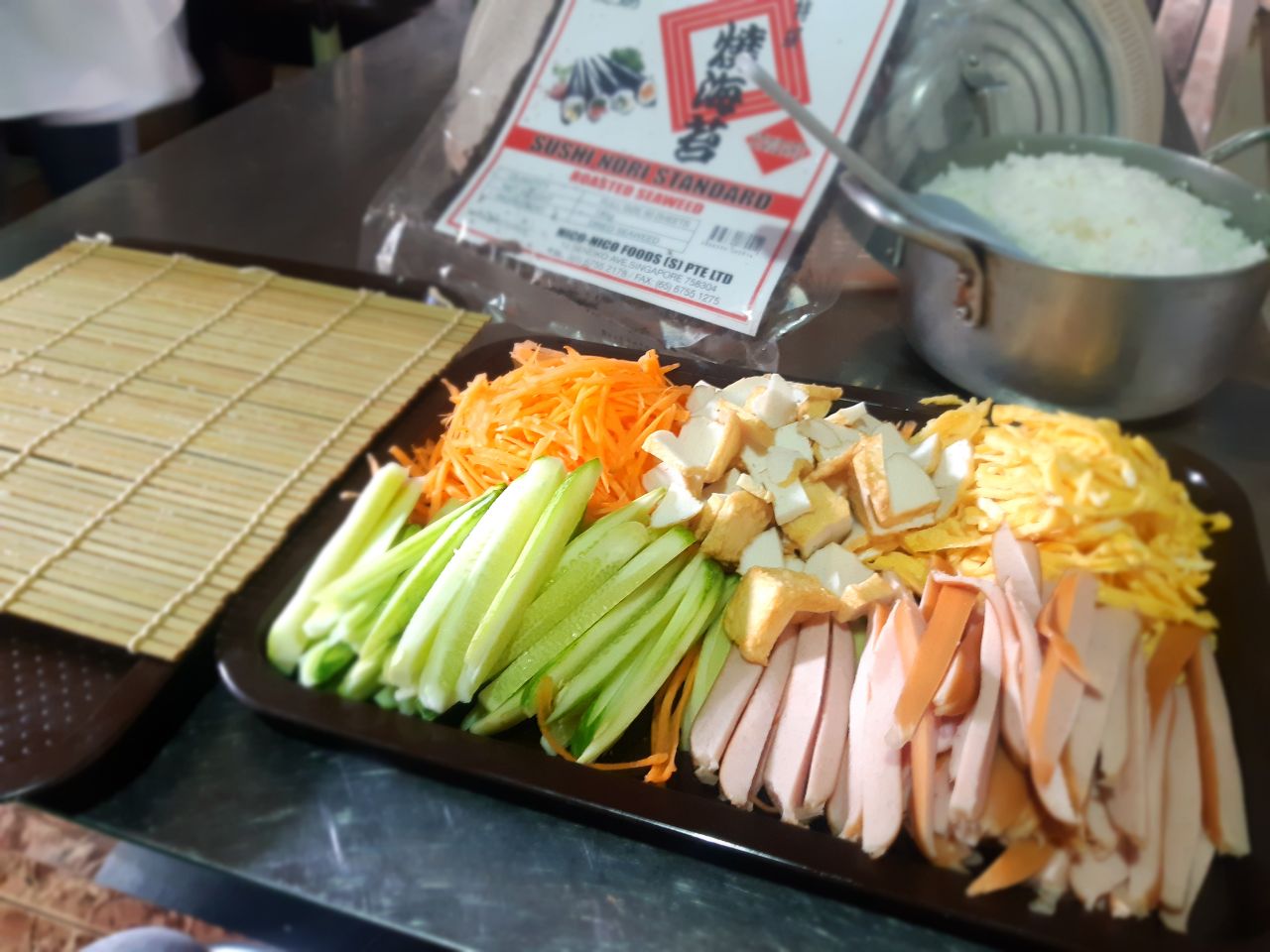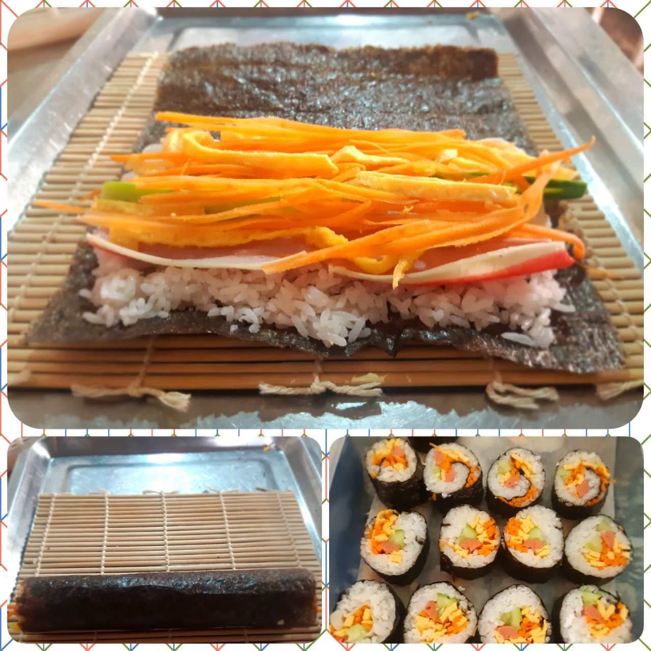 > រាយបន្ទះសារាយសមុទ្រនៅលើក្តារមូរ ហើយដាក់បាយដំណើប ១ ស្លាបព្រា ដោយរាយប៉ាតៗពីលើសារាយសមុទ្រ ហើយដាក់បន្លែ ស៊ុត និងសាច់ពីលើ រួចចាប់ផ្តើមមូររុំឲ្យតឹង