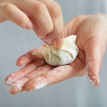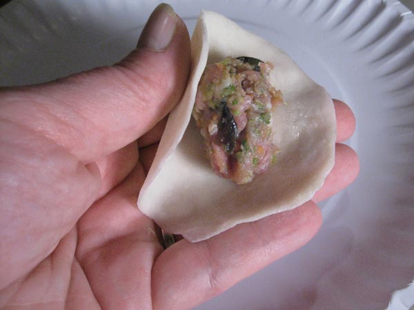 > លាតសំបកគាវដាក់លើបាតដៃ រួចដួសស្នូលម៉ាល្មមដាក់លើ ហើយខ្ចប់ឲ្យសាច់នៅក្នុងសំបកជិតល្អ